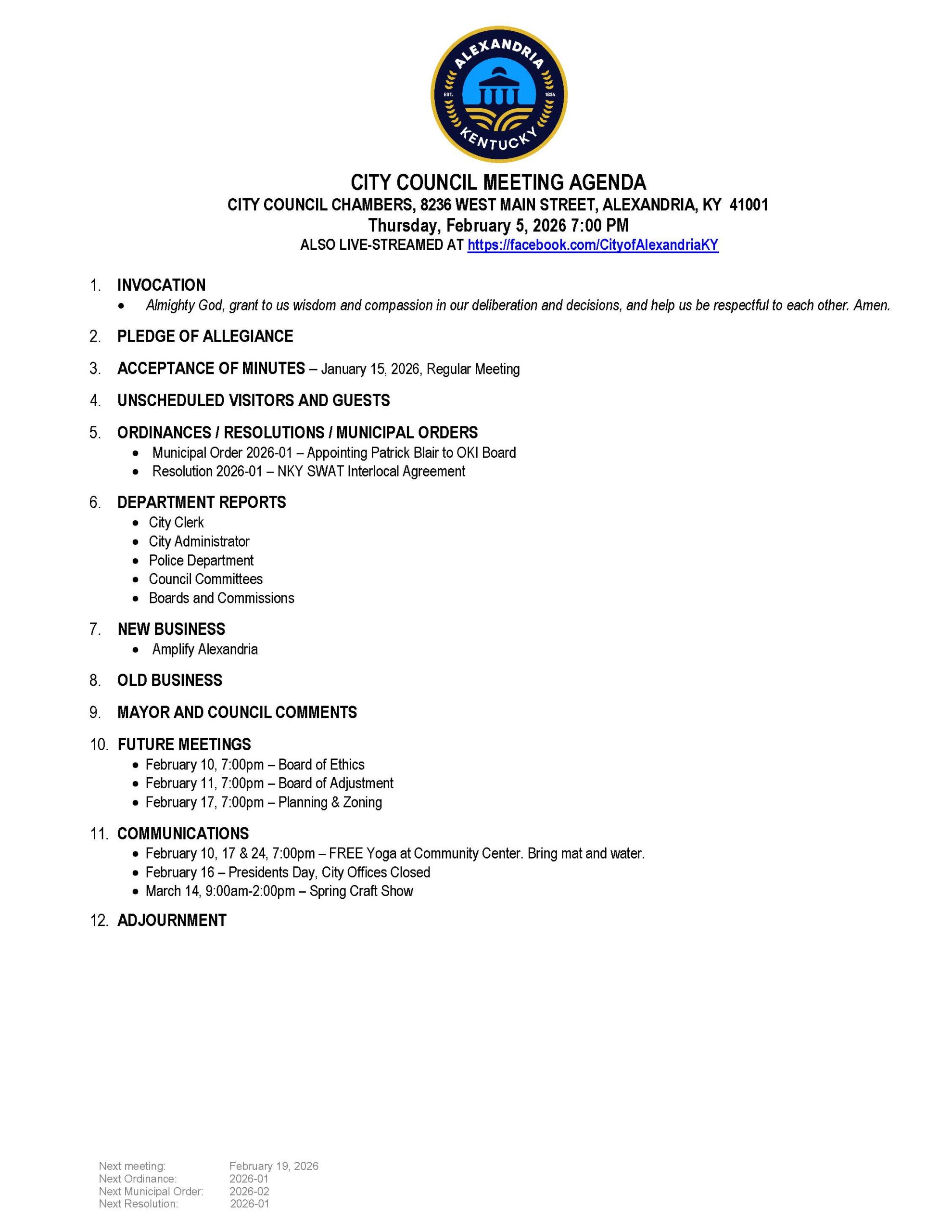 Alexandria City Council meets on a regular basis on the first and third Thursdays of each month at 7:00 p.m. in Council Chambers of the City of Alexandria, 8236 West Main Street. The meetings usually last approximately 20-30 minutes and are open to the public. The council meetings are also now live streamed at https://facebook.com/CityofAlexandriaky. You may also view on cable channel 16 on various days, or on your personal computer by clicking HERE