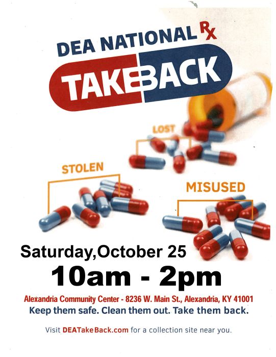 October 25, 10:00am – 2:00pm – National Drug Take Back Initiative. Front of Community Center. Flyer