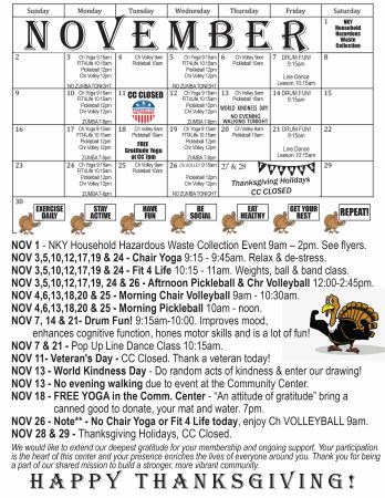 November 26 – NOTE** – No Chair Yoga or Fit 4 LIfe today, enjoy Chair Volleyball at 9:00am