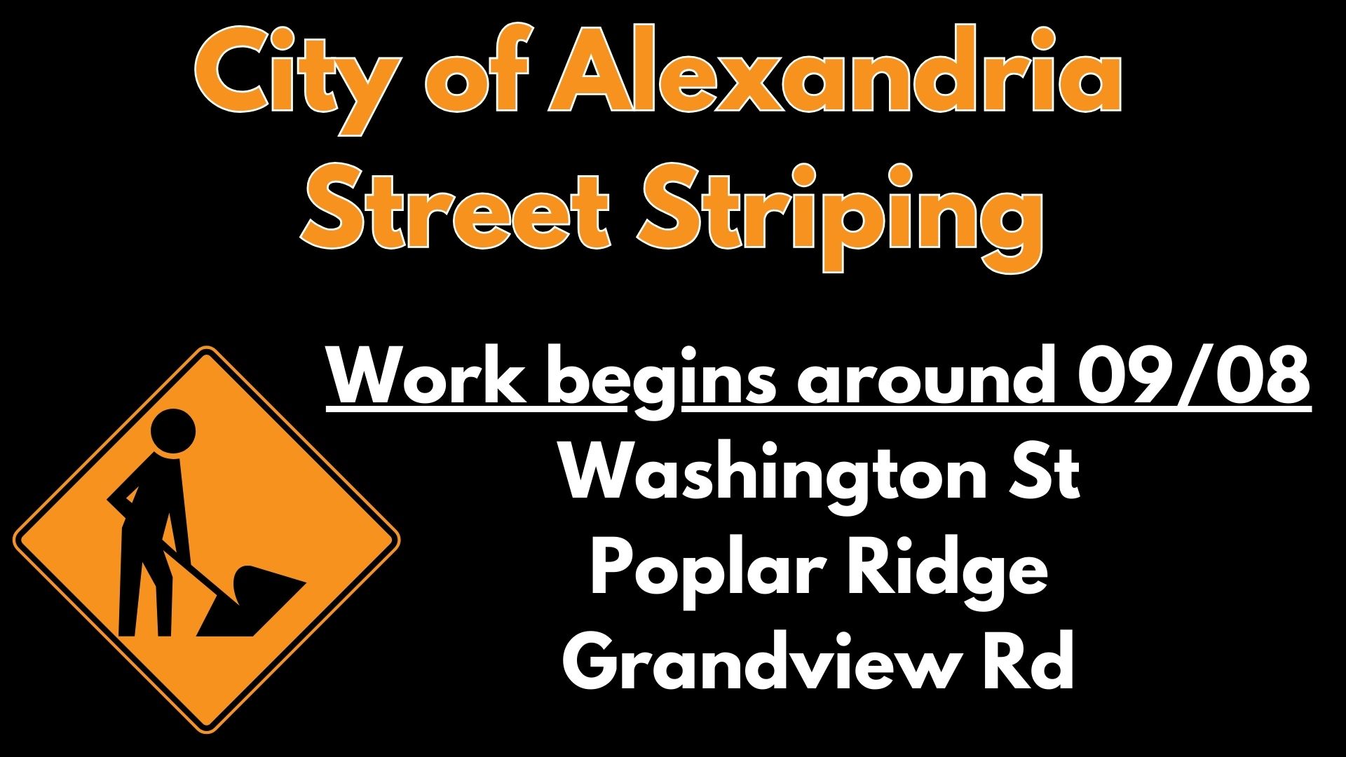 The City of Alexandria has contracted with a company to restripe the center lines and STOP bars on Washington St, Poplar Ridge and Grandview. They will also repaint the parking stalls on Washington St.